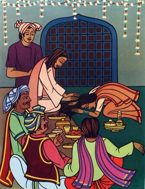 एक स्त्री प्रभु येशु पर इत्र लगाती है